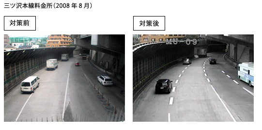 ETCのお客さまが増えたため、料金所ブース前後を走行する車両の速度が以前に比べ速くなりました。そこでブースへ入る時・出る時の走行位置が確認し易くなるよう、料金所ブース前後に誘導線(ドット線)を追加した結果、車線変更ウィンカーを点灯なさるお客さまが増えて安全性が向上しました。(2008年8月~2009年2月) 首都高の料金所での事故のほとんどは速度超過が原因です。十分に速度を落とし左右の車両を確認し、お互いに譲り合っての合流をお願い致します。