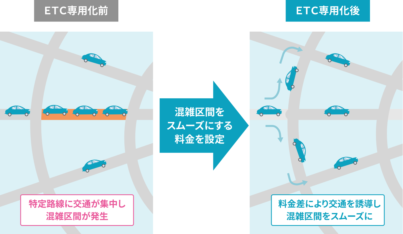 ETC車と現金車の錯綜、停車・発進の繰り返しが削減され、安全性と快適性が向上します。