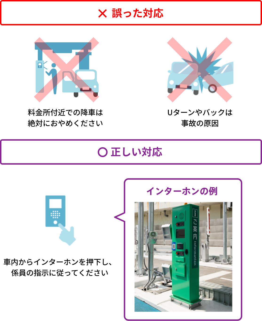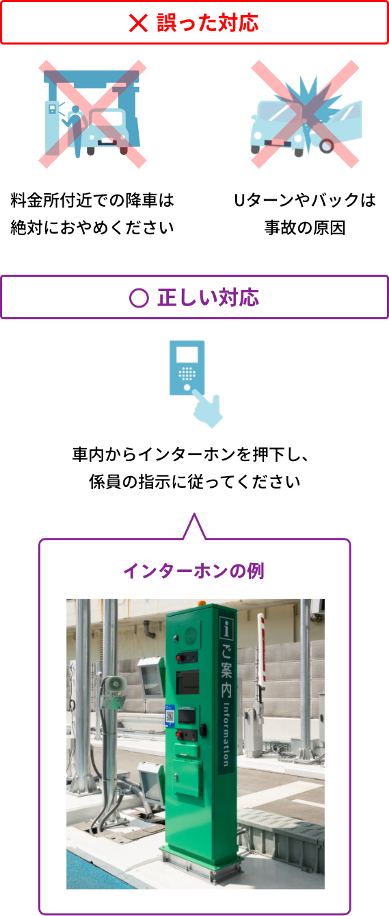 誤ってETC専用入口に進入した場合は、大変危険ですので、Uターンやバックはせず、サポートレーンにお進みいただき、インターホンの横に停車した後、呼出ボタンを押下し、係員の指示に従ってください。なお、運転免許証の提示を求めることがあります。また、料金所付近での車両からの降車は大変危険ですので絶対におやめください。