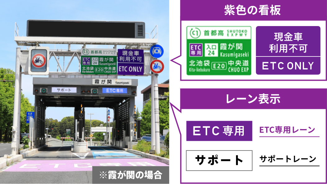 ETC専用入口では、現金、クレジットカード、ETCカードの手渡しでの料金のお支払い、利用証明書の発行はできません。