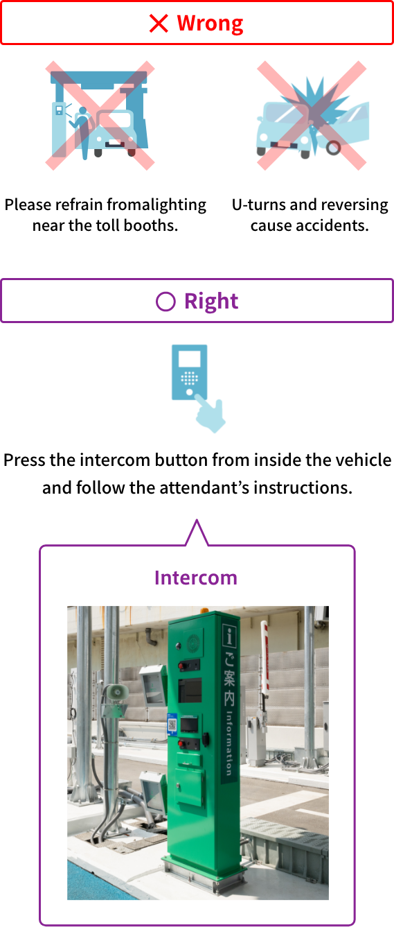 If you accidentally enter the ETC-only entrance, it is extremely dangerous to make a U-turn or reverse. Please proceed to the support lane, stop next to the intercom, press the call button, and follow the instructions of the staff. You may be asked to present your driver's license. In addition, it is extremely dangerous to get out of your vehicle near the toll booth, so please refrain from doing so.