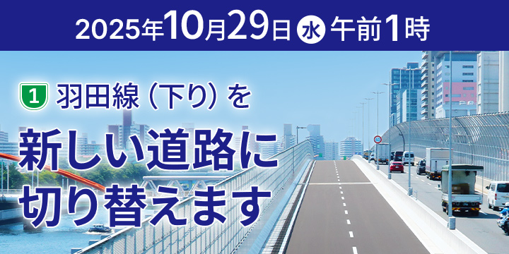 - 更新上り線への切り替え工事の一環として、車線改良のため2026年春頃の土日に羽田線(下り)を通行止めして作業を実施する予定です。
