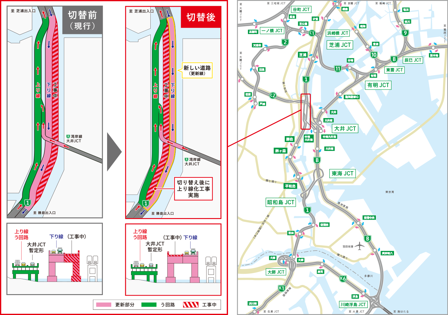 - 更新上り線への切り替え後、現在う回路に接続している大井JCTを更新上り線へ繋ぎなおすため、大井JCTの通行止め実施し、接続部の造り替えを実施予定です。