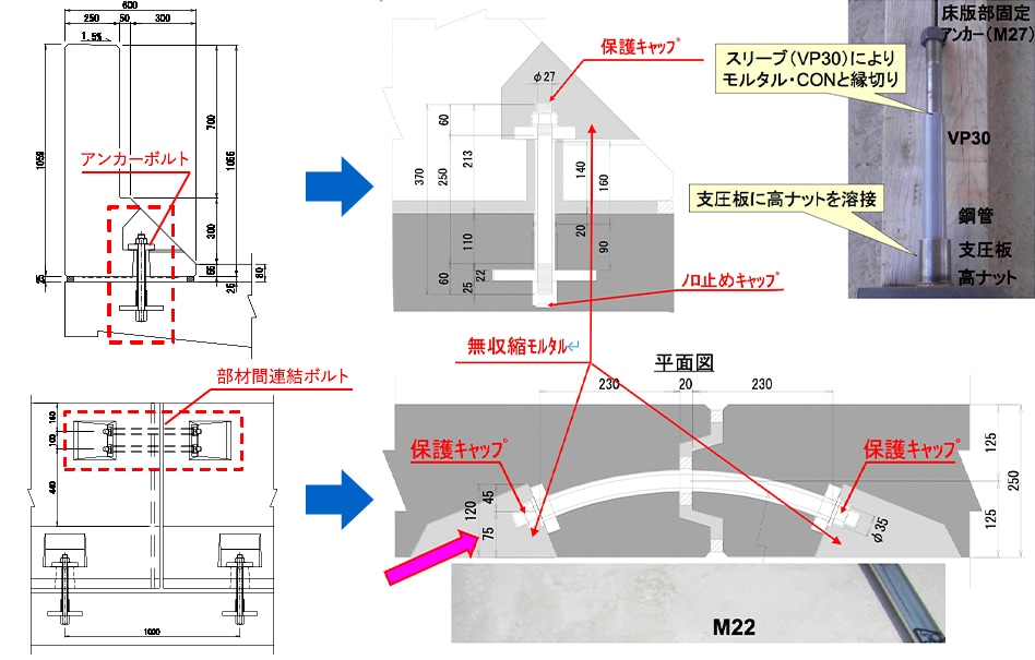 プレキャスト部材を使用することと、床版との固定および部材同士の接続に取替え可能なボルトを使用することで、場所打ち壁高欄と比較すると、施工性が向上し、工程も1/5程度に短縮可能である。また、想定外の荷重が作用した場合も、壁高欄基部が先行して破壊するよう設計しており、万が一破損しても床版に損傷が及ばず、ボルト接合としているため交換作業も容易で、維持管理性の向上が期待できる。使用するボルトには防錆処理を施しており、接合部の無収縮モルタル充填部にも適切な止水処理を行うことで、十分な耐久性を確保している。さらに、床版上での作業となるため、足場や防護工の設置・解体作業が最小限となり、施工時の安全性も向上する。
