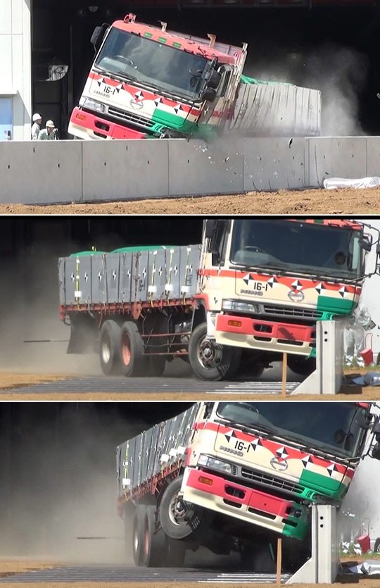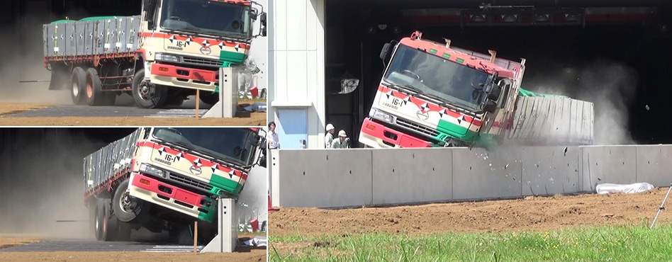 EMC壁高欄が、車両用防護柵としての耐力や要求性能を満足しているかを確認するために、静的載荷実験と実車衝突実験を実施した。静的載荷実験により、設計上の衝突荷重に対して約4倍の耐荷力が得られ、十分な耐力を有する構造であることを確認した。また、実車衝突実験では、25tトラックが衝突角度15度、時速65kmで衝突する際と同等の衝撃度に対して、性能低下を引き起こさず、全ての要求性能を満足する結果が得られている。