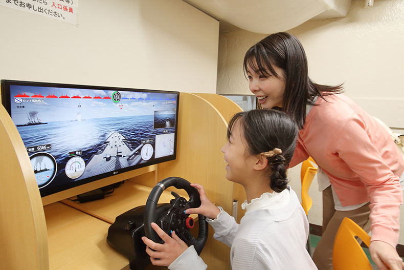 シミュレータールームでは、三笠の操舵手となってバルチック艦隊と戦う疑似体験ができる