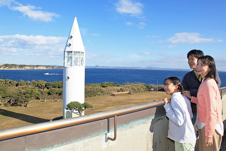 城ヶ島の東側半分を占める広大な自然公園。松の並木を過ぎた先にはシンボルの安房埼灯台が立つピクニック広場が広がり、展望台からは東京湾や対岸の房総半島までを見晴らせる。周辺には、「馬の背洞門」や11月から4月にかけてウミウが飛来する断崖絶壁など、ダイナミックな景勝地も。