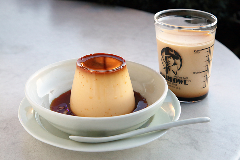 プリン(左)はドリンクとセットで1430円~。ビーカー入り(右)はテイクアウトのみ
