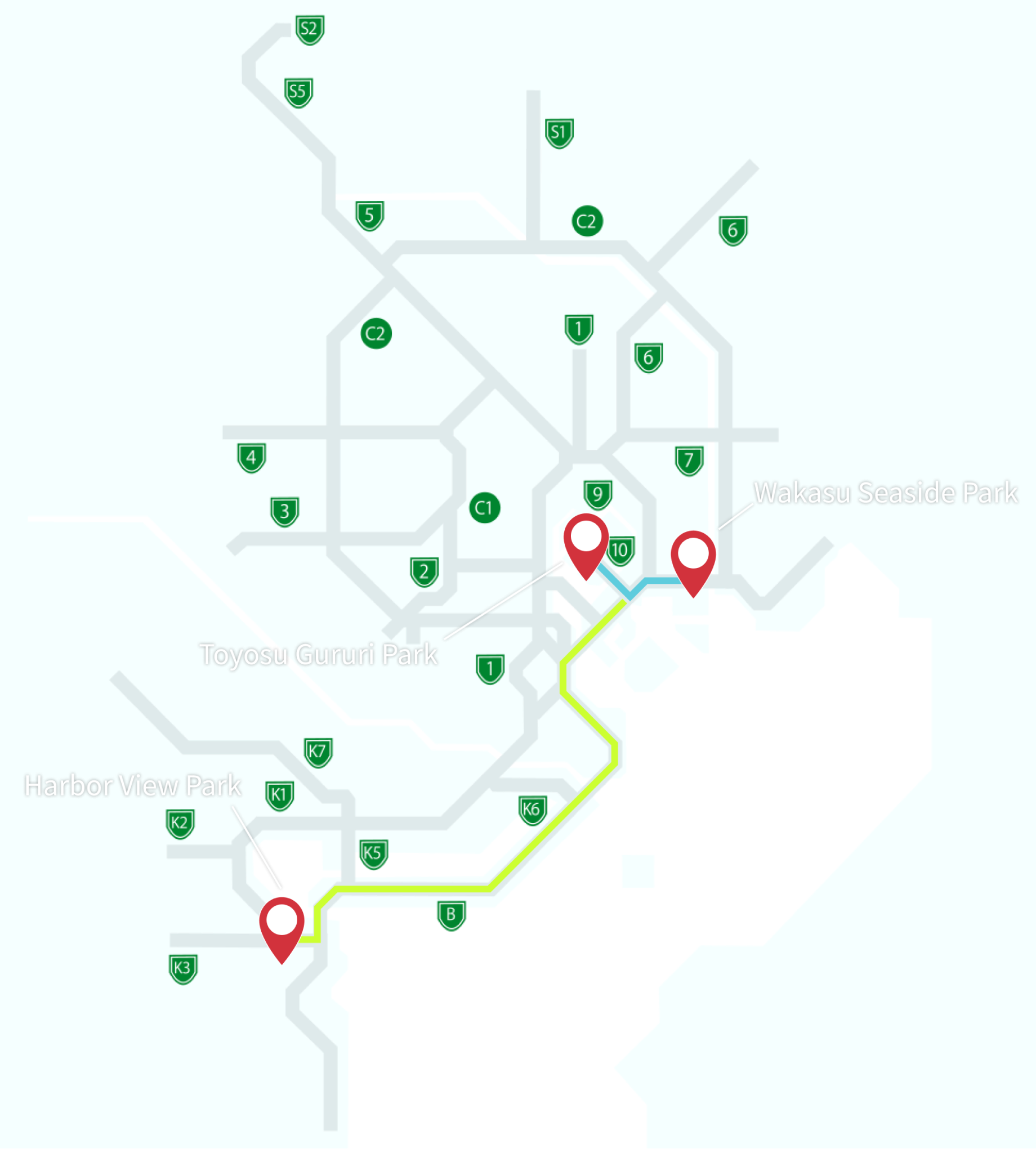 Next, from “Shinkiba Entrance,” take the Metropolitan Expressway Bay Shore Route westbound, then continue via Shinonome JCT and Route 10 Harumi Line to Toyosu Gururi Park.