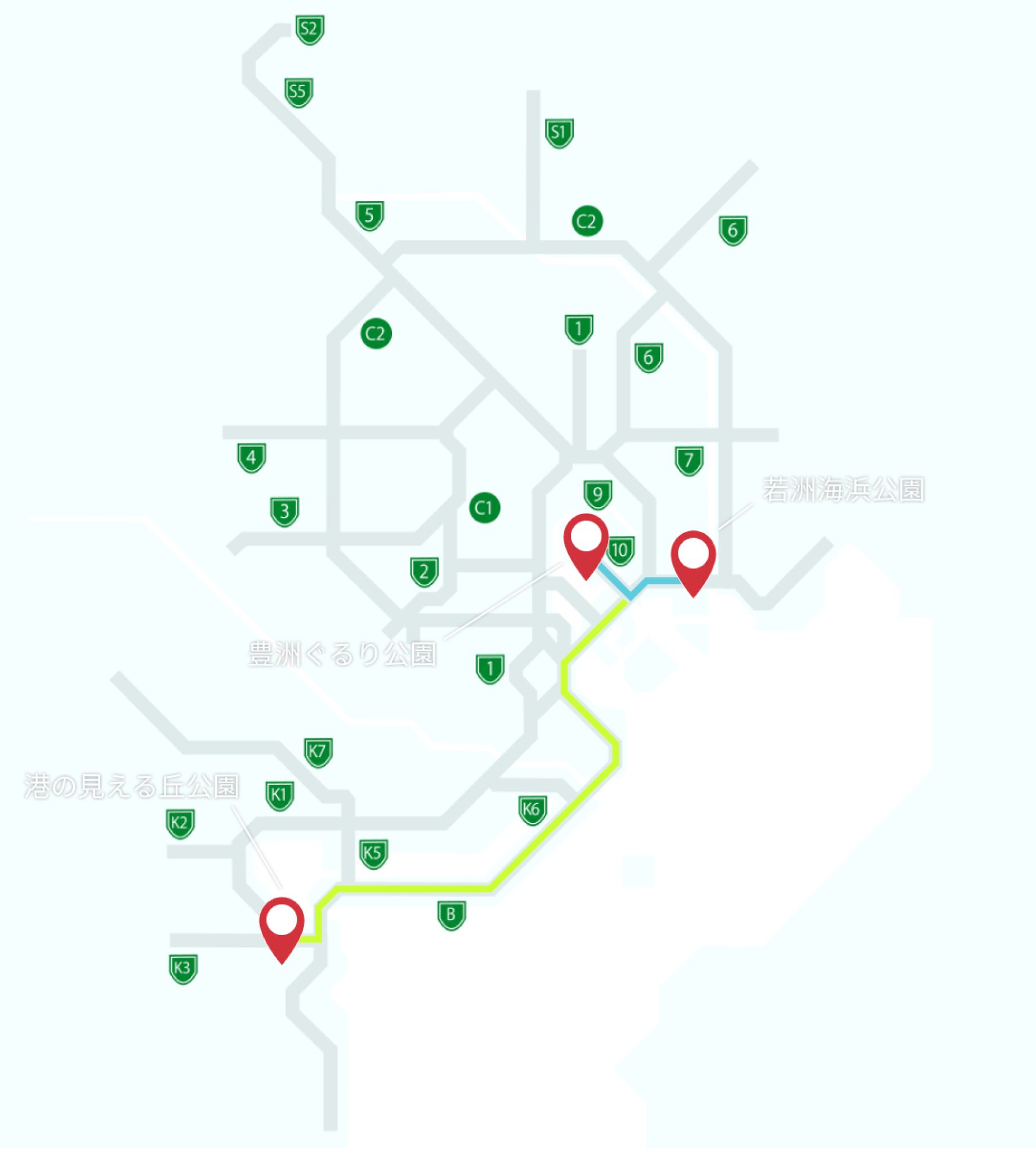 続いては「新木場入口(湾岸線)」から首都高速湾岸線(西行き)首都高に乗り、東雲JCT・10号晴海晴見線を経由して豊洲ぐるり公園へ。