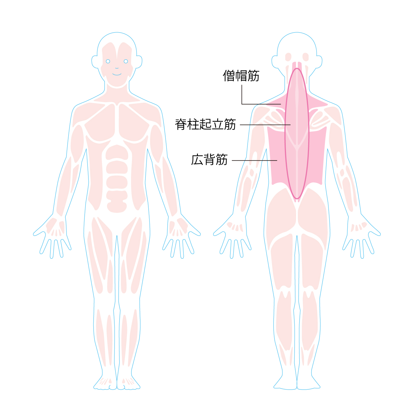 今回アプローチした部位:僧帽筋、脊柱起立筋、広背筋