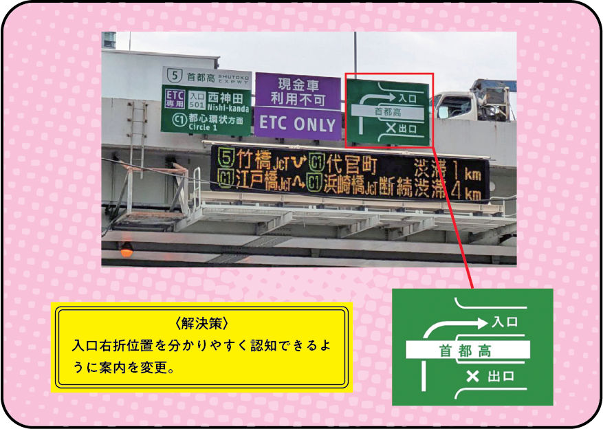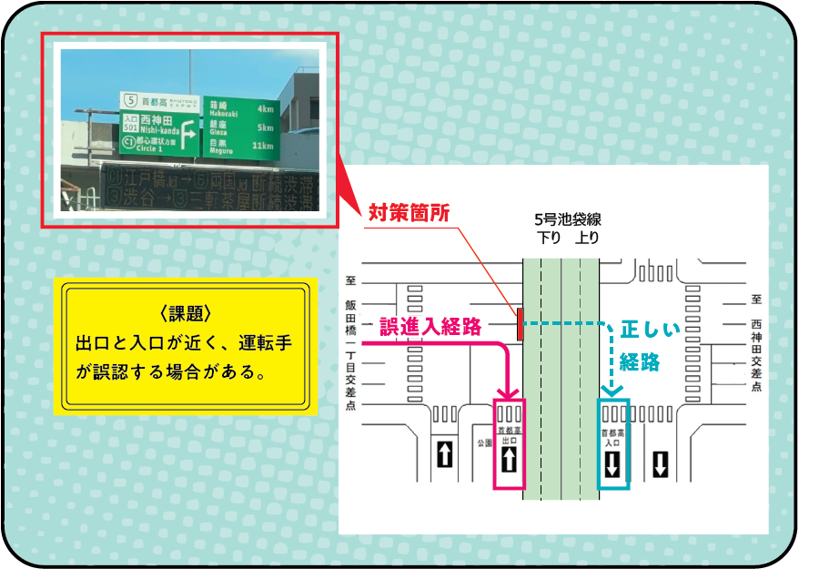 出口と入口が併設されているため、既存の標識だと見分けがつきにくく、誤って下り出口へ進入しそうになります。