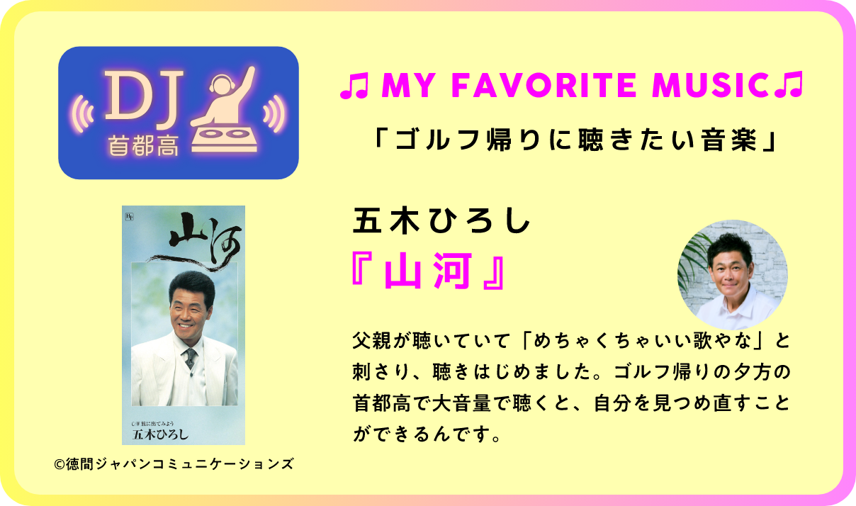 ゴルフはちょっと遠出なので、首都高をよく利用します。家族と一緒のときはわちゃわちゃが勝るんですが、ゴルフのときは1人なので、首都高を楽しみます。行きは80年代後半~90年代のアガる曲、帰りの時間帯には演歌を聴きながら。浜崎橋JCTから芝公園付近を通るときに見える東京タワーや、飯倉トンネルを越えて3号渋谷線に入るあたり、六本木~渋谷を通ると、やっぱりむちゃくちゃ都会やなって思うし、あぁ自分、東京に出てきてんやなって、改めて思う瞬間でもあります。