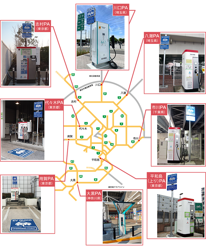 首都高では電気自動車をお使いになる方が安心してドライブできるよう、8か所のパーキングエリアにEV用急速充電器を設置しております。