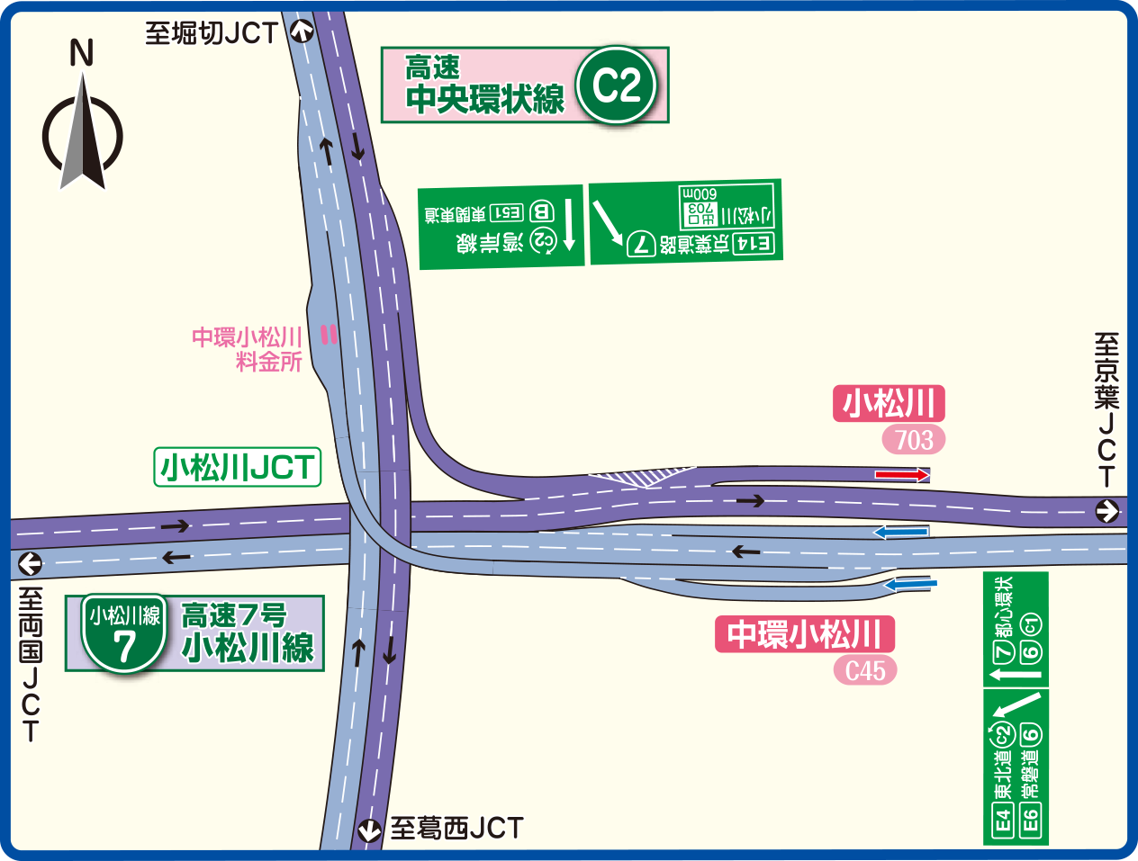 2019年12月1日に開通した中央環状線の小松川ジャンクション・中環小松川入口についてご案内いたします。 小松川ジャンクション新設に伴い、埼玉方面と千葉方面の相互通行が可能となりました。新設の中環小松川入口で、中央環状線の埼玉方面へご利用いただけます。また、小松川出口(下り)は、分岐が右側から左側へ変更となりました。詳細は「ご利用案内」をご参照ください。 動画(首都高ドライバーズサイト内、「料金・ルート案内」)とあわせて、安全な運転の参考にご活用ください。